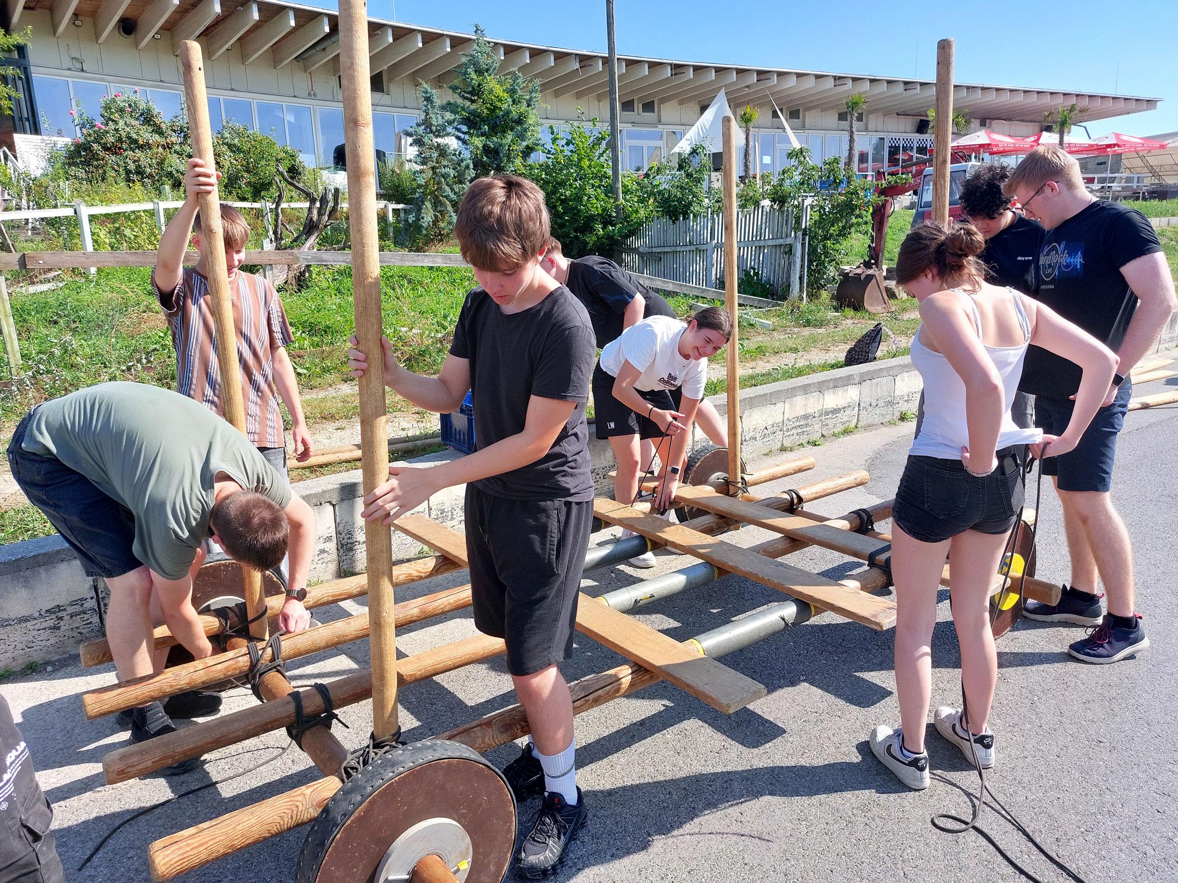 Mit einfachen Materialien wie Stangen, Brettern, Leinen und Rädern galt es, in 6 durchmischten Teams kreative Steinzeit-Vehikel zu entwerfen und zu bauen. Neben handwerklichem Geschick waren vor allem Teamgeist, Kreativität und Einsatz gefragt. Jedes Team gestaltete zudem seine eigene Flagge mit einem individuellen Namen.