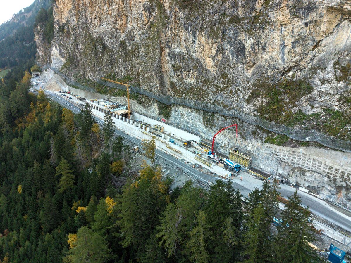 Entlang der Reschenstraße (B 180) entsteht zwischen Pfunds und Nauders (Bezirk Landeck, Tirol) eine 400 m lange Schutzgalerie als dauerhaftes Sicherungsbauwerk gegen Steinschlag und Blocksturz. Für die anspruchsvollen Rahmenbedingungen – enge Platzverhältnisse, steiles Gelände und Bau unter laufendem Verkehr – kommen maßgeschneiderte Schalungs- und Traggerüstlösungen von Doka zum Einsatz.