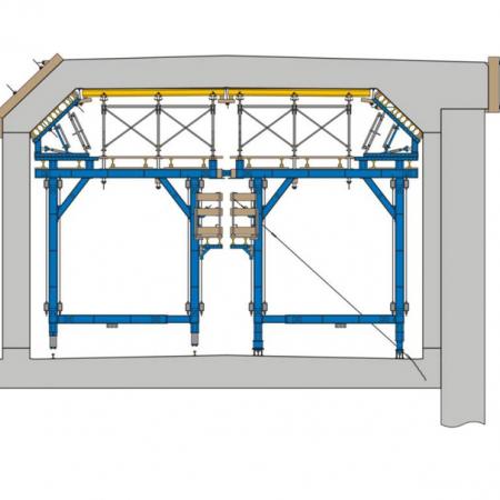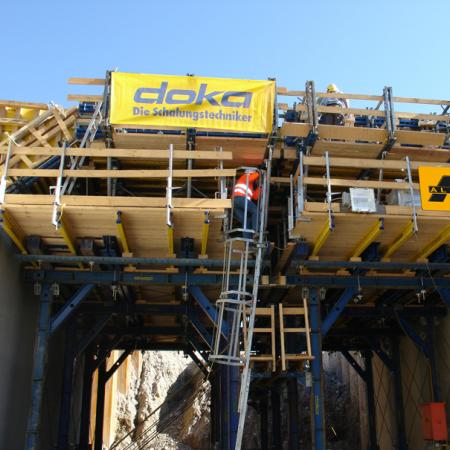 Der 634 m lange Eisenbahntunnel wurde von der Firma Alpine Bau GmbH in offener Bauweise errichtet. Für die im Querschnitt gevoutete Tunneldecke stand ein leistungsstarker Doka-Deckenschalwagen im Einsatz. Aufgrund der variierenden Querschnittsform plante Doka einen leicht adaptierbaren Schalwagen, der in der Mitte geteilt ausgeführt wurde.