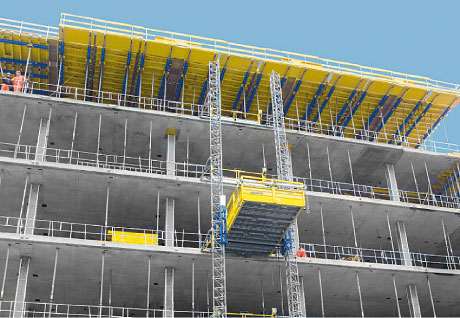 Snel bouwproces zonder kraan: met het tafelliftsysteem TLS worden vloertafels met één druk op de knop naar de volgende etage gebracht.