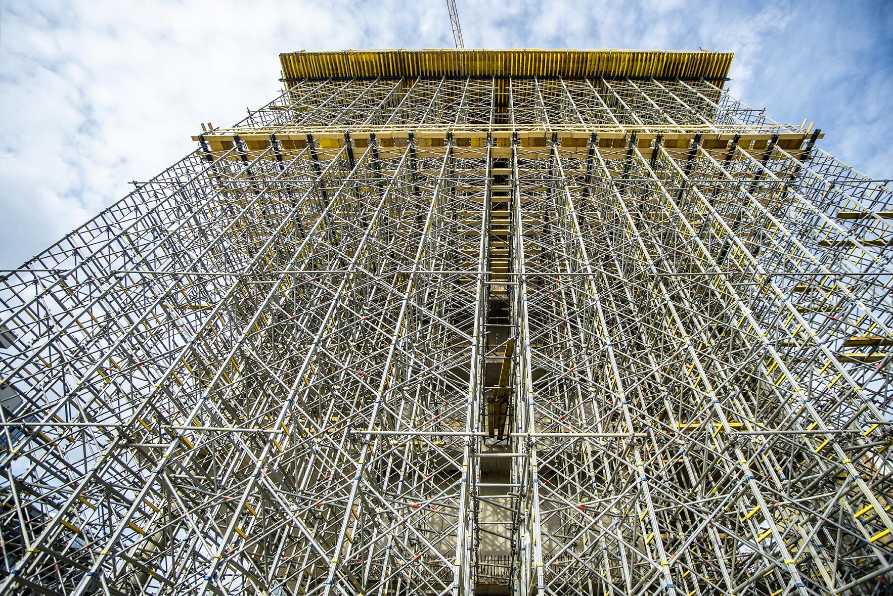 Celkově konzoli vynáší více než 5000 prvků systému Staxo100. Ale samozřejmě na stavbě nejde jen o podporu konzole, probíhá i realizace monolitických stropů pomocí systému Dokaflex, nebo konstrukcí svislých pomocí rámového bednění Framax. Toho je mimochodem na stavbě více než 608m2. Všechny tyto systémy doplňují komponenty šplhacích bednění Xclimb60, SKE a FF20 pro výjezdové plošiny a další využití v rámci stavby. Samozřejmostí je poctivé zabezpečení stavby pomocí dodaných sloupků zábradlí se systémovými patkami nebo doplnění stavby o pracovní a betonářské plošiny.
