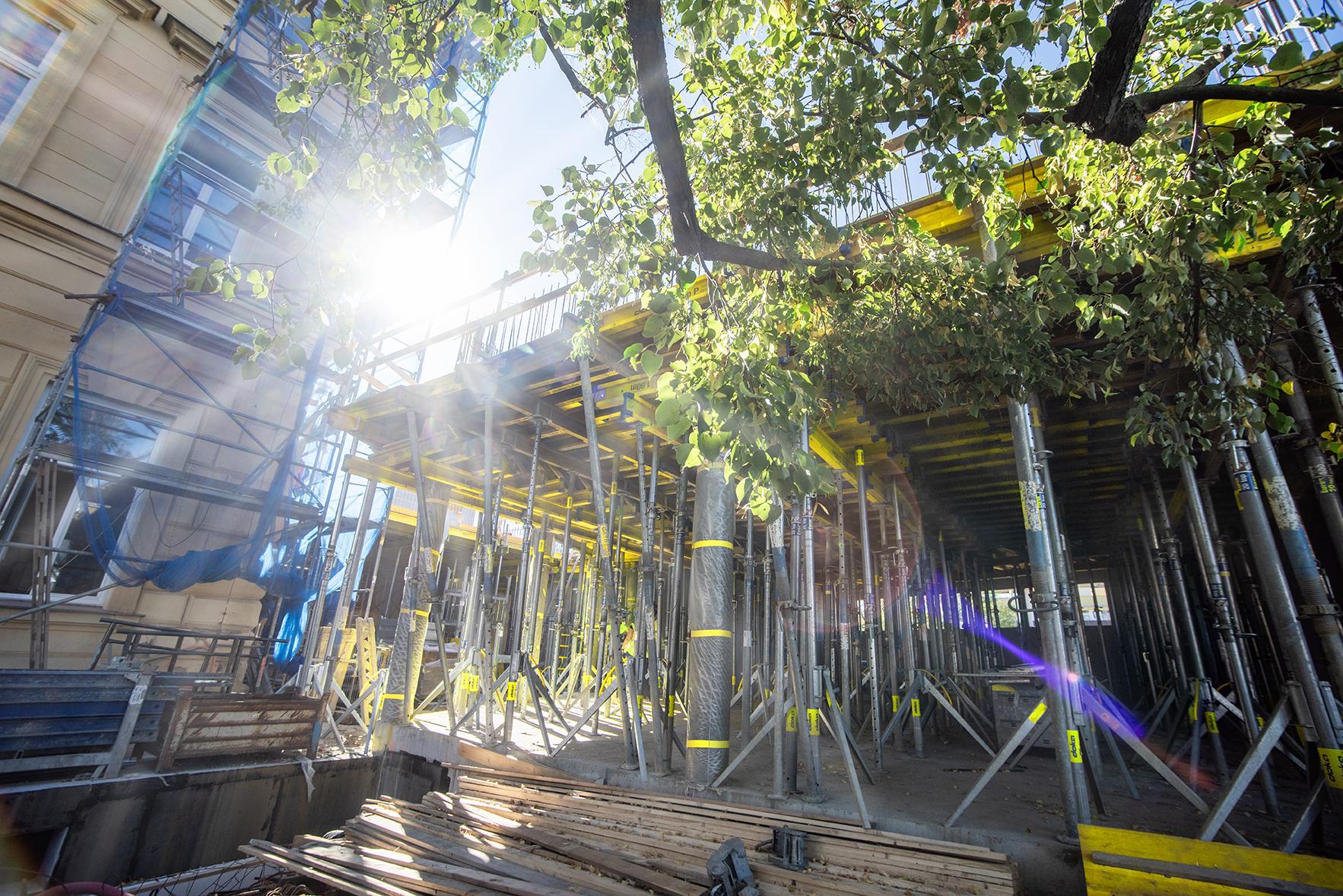 Pro realizaci monolitických železobetonových konstrukcí byla nasazena komplexní řešení od společnosti Doka. Stěnové konstrukce jsou prováděny pomocí rámového systému Framax Xlife, který je ceněný pro svou odolnost a rychlost nasazení. Stropy vznikají s využitím nosníkového bednění Dokaflex, přičemž v prostoru nové auly bylo nutné pro vysoký strop použít stabilní pevnou skruž Staxo 100. Díky flexibilitě systému bylo možné efektivně řešit i náročné prostory s velkými rozpětími.