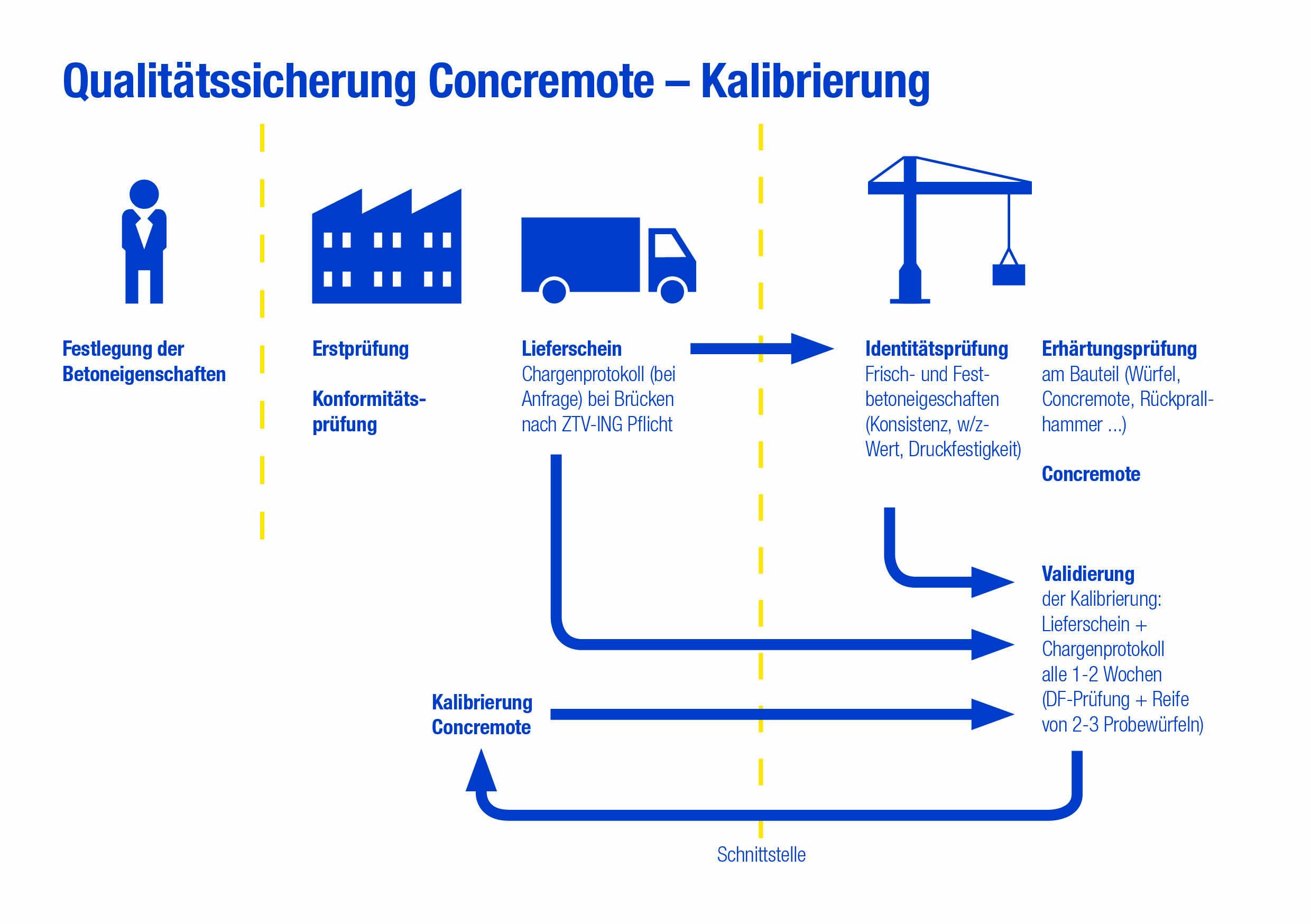Zur Ermittlung der Hydrationswärme erfassen Sensoren kontinuierlich die Temperatur im Beton. Mittels integrierter Mobilfunktechnologie werden die Daten an das Concremote-Rechenzentrum des holländischen Technologieunternehmens Concrefy (ehemals B|A|S) übertragen, das 2016 von der Doka übernommen wurde. Die Festigkeitsentwicklung wird mithilfe des Reifegradverfahrens nach de Vree auf der Grundlage einer zuvor durchgeführten Kalibrierung sowie der im Bauteil gemessenen Betontemperaturen berechnet. Via Webapplikation können Bauunternehmen die Daten dann über PC, Tablet oder Smartphone abrufen.