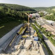 Besondere Herausforderung beim Projekt: Der Rhythmus des Taktschiebens wird maßgeblich durch eine anspruchsvolle Brückengeometrie beeinflusst. Der enge Brückenradius (R=450) sowie eine Veränderung der Querschnittshöhe im ersten und zweiten Takt machten eine frühe Abstimmung zwischen dem ausführenden Bauunternehmen LEONHARD WEISS, weiteren Projektbeteiligten und dem Schalungshersteller Doka notwendig. Um Bauzeit einzusparen, wurde schon während der Angebotsphase die Nutzung von Concremote vereinbart. Hauptziel des Bauunternehmens ist es, Taktzeiten zu optimieren und erste Erfahrungen mit dem System zu sammeln. Speziell überwacht wird der Bereich der Spannglieder in der Fahrbahnplatte, da dieser das weitere Taktschieben und insbesondere das Vorspannen bestimmt. Für jeden der elf Takte des Überbaus kommt ein Kabelsensor mit drei Messpunkten an den notwendigen Nachweisstellen zum Einsatz. Da zudem die Festigkeitsentwicklung errechnet werden soll, wurden im Vorfeld zusätzlich zwei Kalibrierboxen zur Erstellung der Eichkurve eingesetzt. Dank Concremote können nun unter Umständen bis zu 1,5 Tage pro Takt eingespart werden.