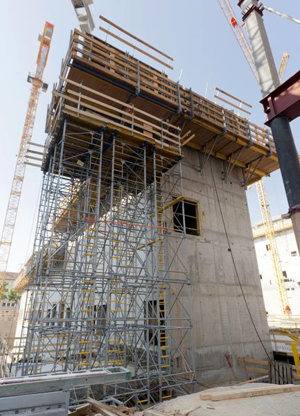 Die Kletterkerne Südwest, Südost, Nordost, Nordwest umfassen je 13 Kerne mit einer Betonierhöhe von je 3,10 m. An Schalung waren dabei nach Angaben von Roman Cibolini, Projektleiter von Doka Schweiz AG auf der Baustelle, vom Unter- bis zum Dachgeschoss je 21.000 m² zu stellen, davon 1.200 m² für nachträgliche Zwischenwände. Das einzubringende Betonvolumen erreichte pro Kern 2.600 bis 3.600 m³, davon 600 m³ für nachträgliche Betonteile wie Zwischenwände, Decken im Kern, Kragdecken und Podeste. An Bewehrungsstahl wurden rund 400 t eingebaut. Pro Klettertakt standen der Arge drei Tage zur Verfügung, entsprechend sechs Arbeitsschichten. Die zum Klettern erforderliche Betonfestigkeit betrug 10 N/mm². Die Betonanlieferung auf die Baustelle, auf der manchmal an gleichzeitig vier Einbaustellen gepumpt wurde, erfolgte aus verschiedenen Transportbetonwerken im Umkreis von Basel.