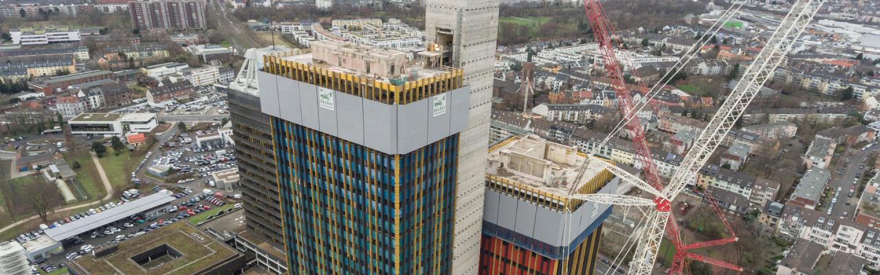 Ein markantes Wahrzeichen von Köln wird 2021 verschwunden sein: Die Türme des ehemaligen Funkhauses der „Deutschen Welle“ sollten zunächst gesprengt werden. Doch aus verschiedenen Gründen wurden die bis zu 138 Meter hohen Hochhäuser seit Mitte Mai 2019 stattdessen von oben nach unten zurückgebaut. Um den Rückbau geordnet und vor allem sicher durchzuführen, war die Expertise von Doka gefragt. Die Schalungsexperten übernahmen die Planung und Montage der Schutzschildeinhausung und schulten die Arbeiter der BST Becker Sanierungstechnik GmbH in puncto Selbstklettertechnik.