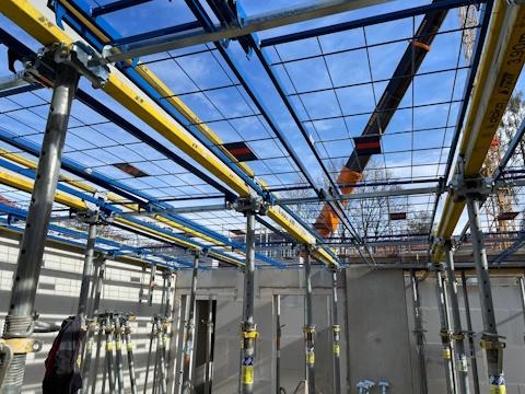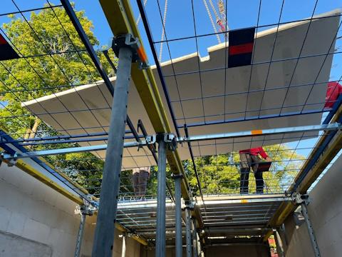 Das Safeflex-System bietet erhöhte Systemstabilität dank der formschlüssigen Verbindung der Jochträger mittels Safeflex-Komponenten. Da die Jochträger, Querstangen und Systemgitter von unten montiert werden können, wird die erste Prämisse für sicheres Arbeiten erfüllt: von der gesicherten Standposition aus. Beim Verlegen von Fertigteilelementen bzw. der Querträgerebene und Schalungsplatten von oben ist der Arbeitsbereich nun durch die Systemgitter kollektiv gesichert. Dies erhöht auch die Effizienz, da so im Regelfall die Notwendigkeit zur persönlichen Sicherung (PSAgA) entfällt. Die Grundkonstruktion ist dank voreingestellter Systemmaße schnell vom Boden aus auf- und abgebaut – das spart Zeit und Kosten, erhöht aber gleichzeitig die Sicherheit. Aufgrund der stabilen Verbindung der Jochträgerebene kann die Anzahl der Stützbeine deutlich reduziert werden, bei Verwendung des Safeflex-Wandhalters sogar fast vollständig. Wird der XT20 von Doka als Jochträger eingesetzt, kann dies nochmal spürbar den Bedarf an Material sowie Zeit (zur De-/Montage) verringern.