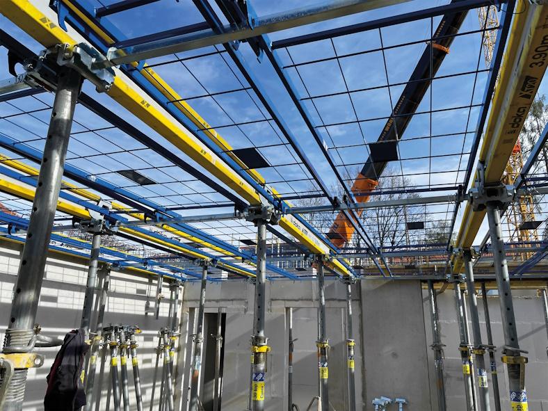 Das Safeflex-System bietet erhöhte Systemstabilität dank der formschlüssigen Verbindung der Jochträger mittels Safeflex-Komponenten. Da die Jochträger, Querstangen und Systemgitter von unten montiert werden können, wird die erste Prämisse für sicheres Arbeiten erfüllt: von der gesicherten Standposition aus. Beim Verlegen von Fertigteilelementen bzw. der Querträgerebene und Schalungsplatten von oben ist der Arbeitsbereich nun durch die Systemgitter kollektiv gesichert. Dies erhöht auch die Effizienz, da so im Regelfall die Notwendigkeit zur persönlichen Sicherung (PSAgA) entfällt. Die Grundkonstruktion ist dank voreingestellter Systemmaße schnell vom Boden aus auf- und abgebaut – das spart Zeit und Kosten, erhöht aber gleichzeitig die Sicherheit. Aufgrund der stabilen Verbindung der Jochträgerebene kann die Anzahl der Stützbeine deutlich reduziert werden, bei Verwendung des Safeflex-Wandhalters sogar fast vollständig. Wird der XT20 von Doka als Jochträger eingesetzt, kann dies nochmal spürbar den Bedarf an Material sowie Zeit (zur De-/Montage) verringern.