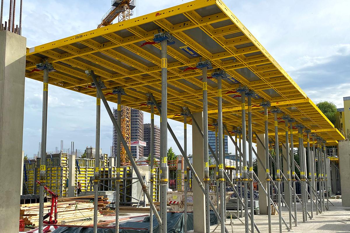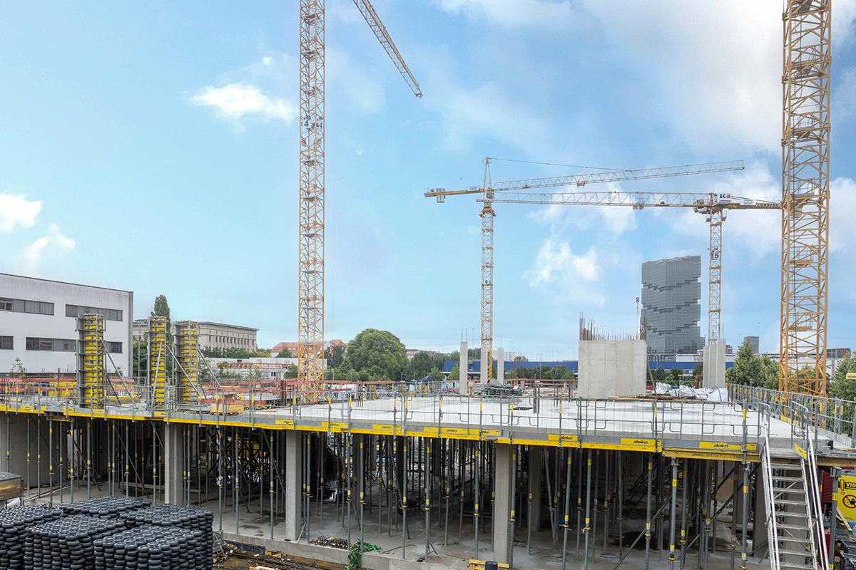 Tatsächlich hatte man in dieser Konstellation – Edge als Entwickler, ZÜBLIN als ausführende Baufirma, Doka als Schalungsexperte – bereits beim EDGE East Side zusammengearbeitet. Wie bereits beim Highrise-Projekt an der Warschauer Straße – per Luftlinie nicht mal einen Kilometer vom neuen Bauprojekt entfernt – kommen auch beim „EDGE Friedrichspark“ Dokas bewährte Decken- und Wandschalungssysteme zum Einsatz, so etwa 4.500 m2 der DokaXdek-Tische. DokaXdek ist das neueste Deckenschalungssystem von Doka, das vielseitig einsetzbar und kombinierbar sowie äußerst langlebig ist, und dabei mit besonders viel Sicherheit und Wirtschaftlichkeit punktet.