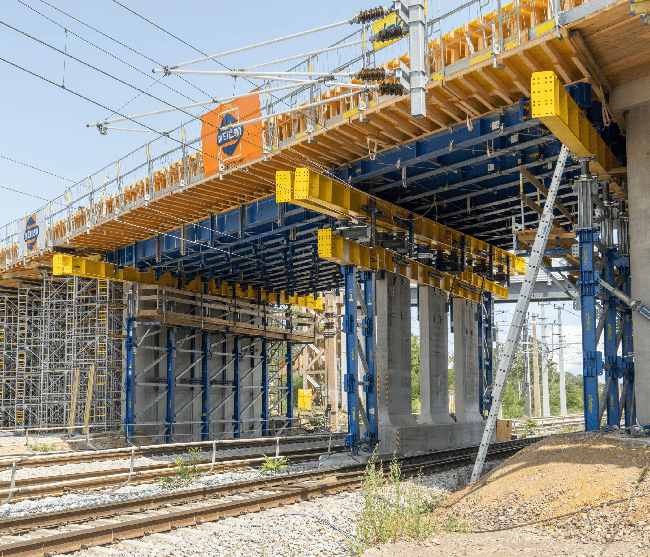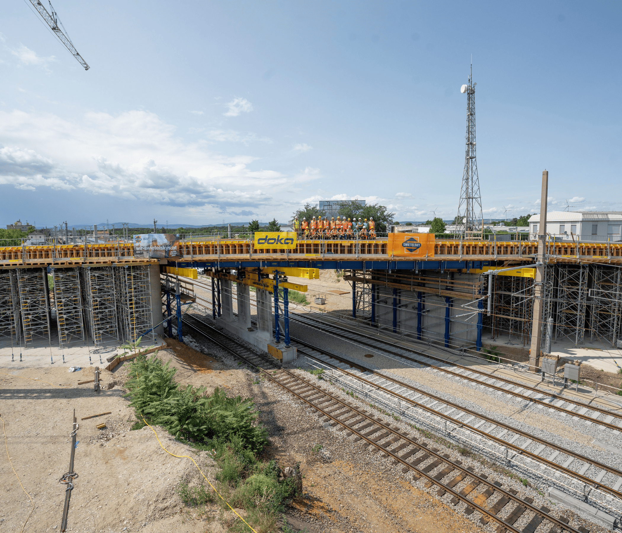Eine besondere Herausforderung bei diesem Bauvorhaben stellte die Einhaltung des Lichtraumprofils dar, das für den ungehinderten Zugverkehr freigehalten werden musste. Denn außerhalb der kurzzeitigen nächtlichen Sperren wurden die Gleise auch während der Bauphase befahren. Statt eine kostspielige, massive Stahlbau-Sonderanfertigung für die Unterstellung der Gleisbereiche zu beauftragen, konzipierte Doka eine leistungsstarke Unterstellung aus dem mietbaren Baukasten-System Doka UniKit. Ein bestehender Pfeiler der alten Brücke wurde dafür abgeschnitten und als Hilfspfeiler genutzt. Da das Aufrüsten den Mittelpfeilers aufgrund der Gleissperren sehr zeitkritisch war, bereitete sich die Baustellenmannschaft mit einer von Doka aufbereiteten Animation der „digitalen Vormontage“ auf diese Arbeiten vor.