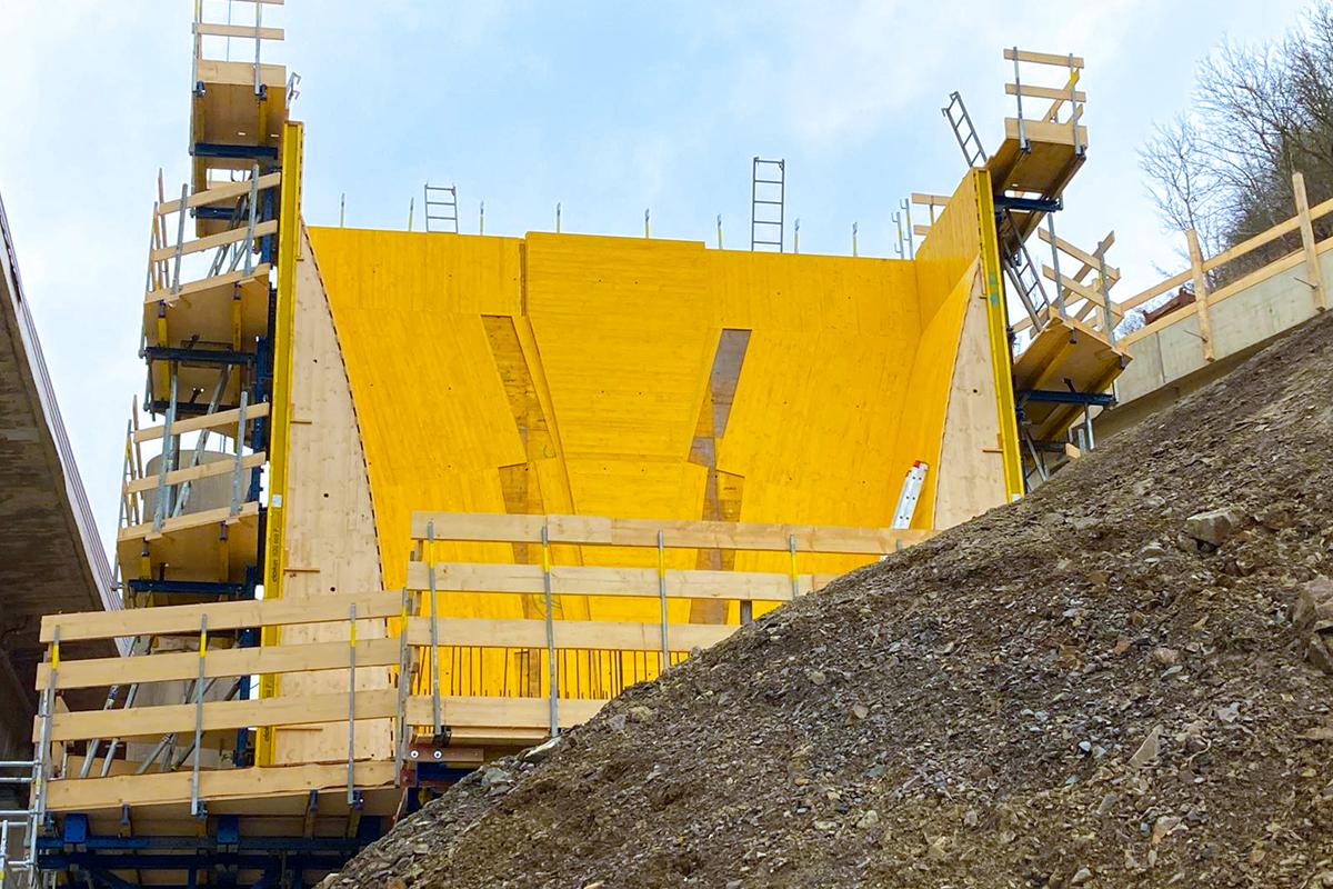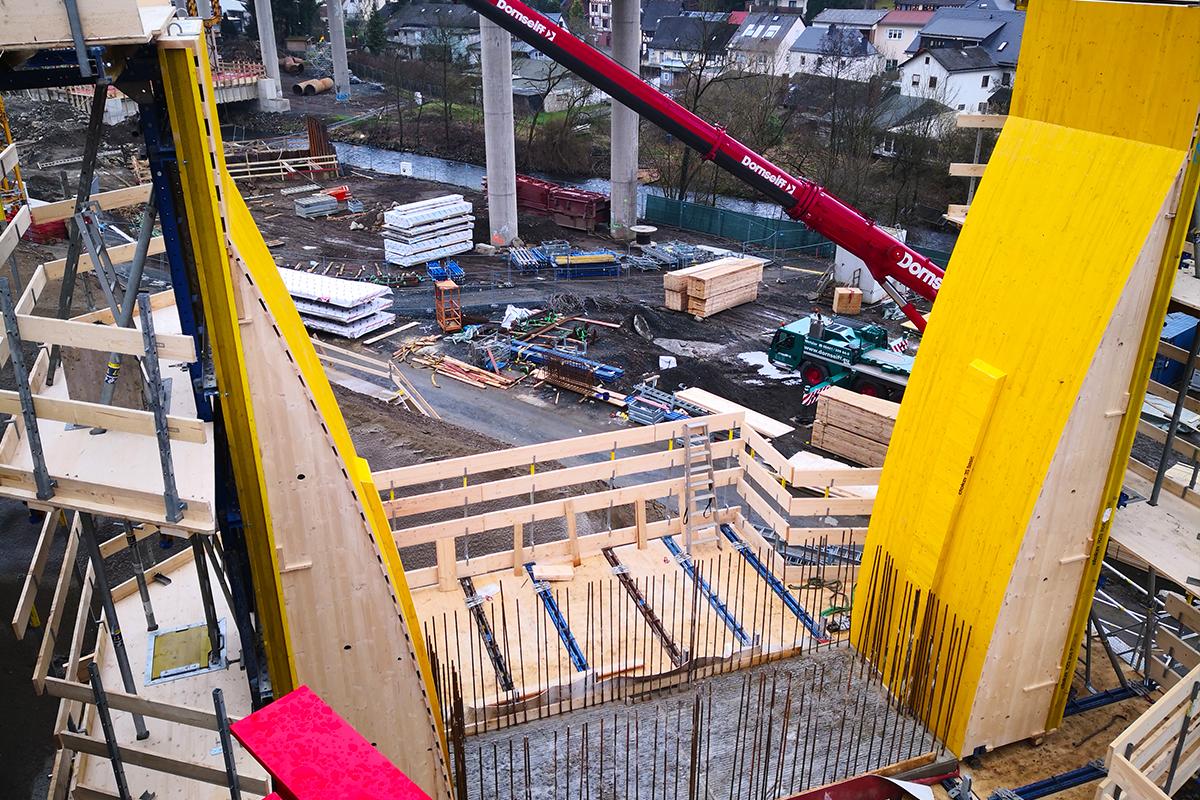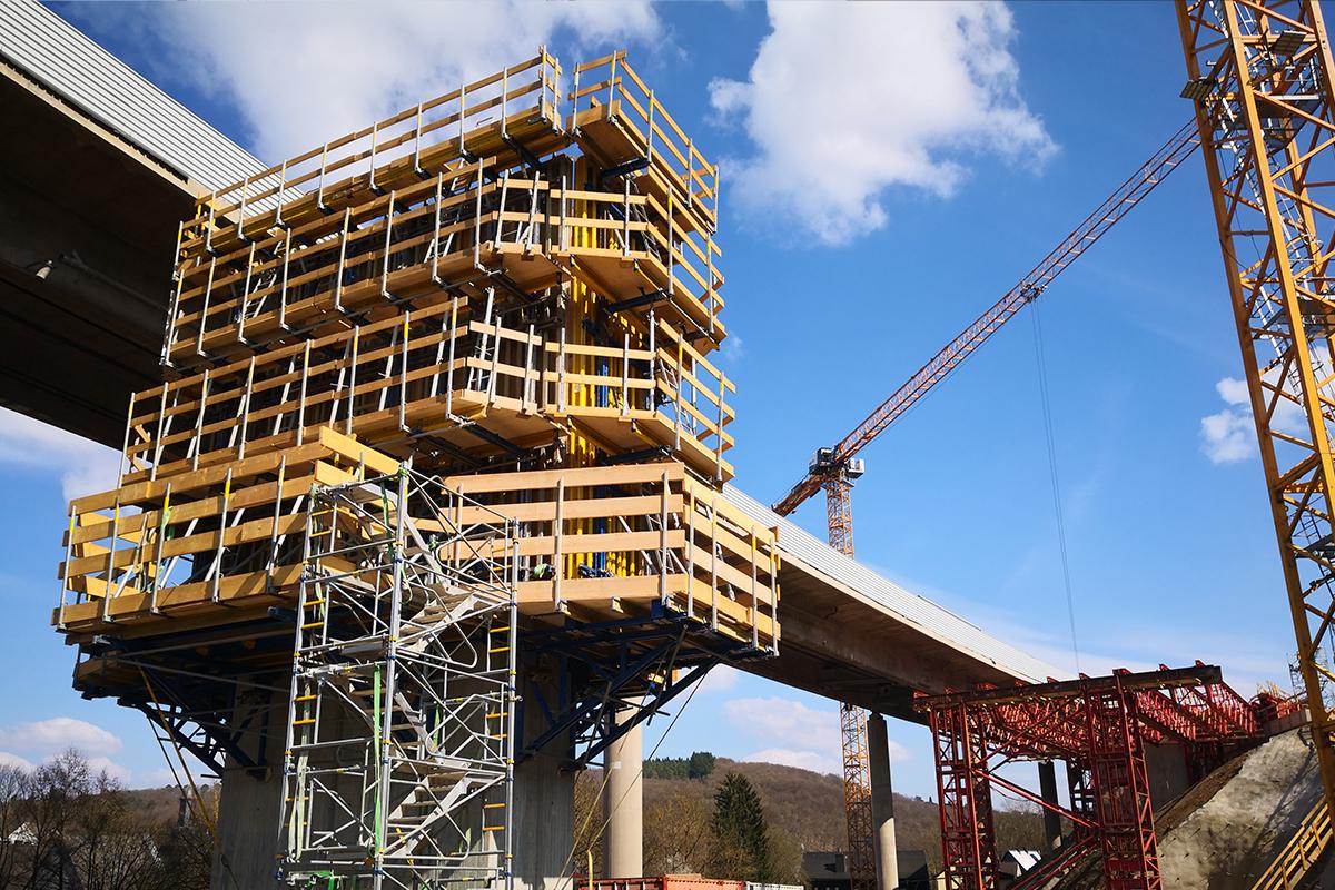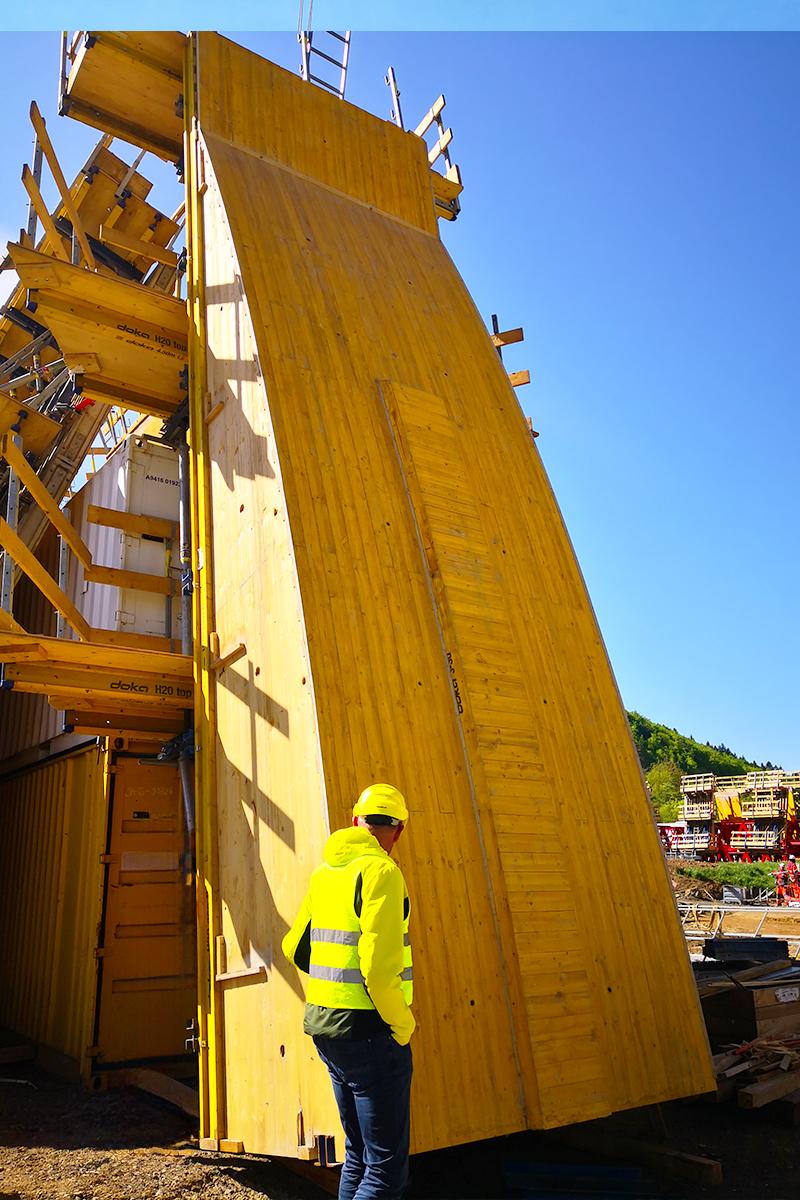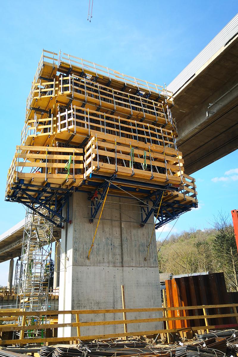 Auch die Dimensionen haben es in sich. Rund 930 m Länge, 14 Pfeiler je Fahrtrichtung, massive Fundamente und hohe Widerlager – an den Überbaufeldern mit Vouten, die das konstruktive Level noch einmal erhöhen. Ebenso wie die Architektur einzelner Bauwerksteile: Besonders die aufgeweiteten Pfeilerköpfe mit detailverliebter Oberflächenstruktur stellen hohe Ansprüche an den Schalungsbau. Last but not least machen große Bauabschnitte und ein enger Zeitplan die Ausführung auch logistisch zu einer Mammutaufgabe. Schalung, Traggerüst und Sicherheitstechnik – alles muss zur richtigen Zeit am richtigen Ort sein, und das in enormen Mengen. Zwischen Planung, Lieferung, Montage und Demontage bleibt kein Spielraum für Abweichungen.