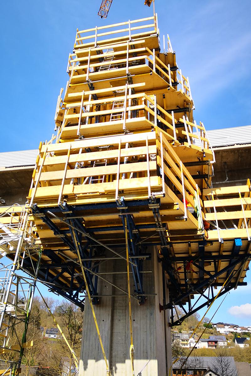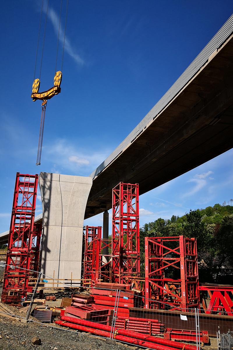 Mit Fundamenten, Widerlagern, Stützwänden und Pfeilern war Doka für sämtliche tragenden Bauteile der Talbrücke Sechshelden verantwortlich und deckte von technischer Planung und Statik über Systembereitstellung bis zu Fertigservice und Schalungsvormontage nahezu die gesamte Diensleistungspalette ab.