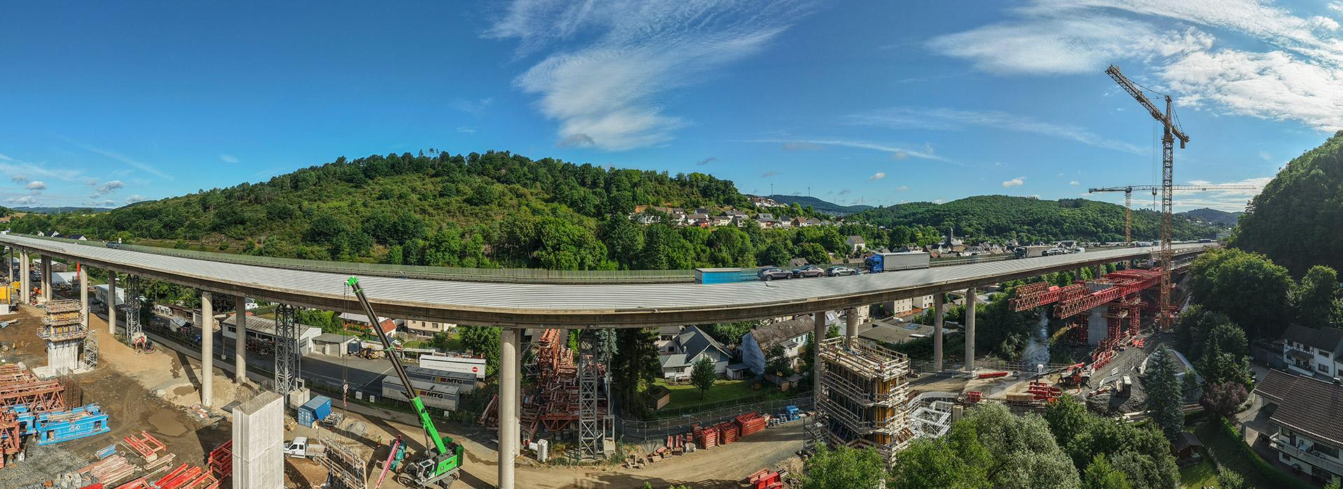 Wie schafft man Neues, wenn das Bestehende nicht stillstehen darf? Brückenbauer in Deutschland stellen sich diese Frage aktuell häufiger denn je. Viele der Bauwerke aus den 1960er- und 1970er-Jahren haben ihre Lebensdauer erreicht, und müssen ersetzt oder erneuert werden, während sie weiterhin täglich tausende Fahrzeuge tragen. So auch die Talbrücke Sechshelden an der A 45 zwischen Dillenburg und Haiger – die bei laufendem Verkehr abgerissen und neu gebaut werden muss und dabei mit zahlreichen Herausforderungen aufwartet. Eine davon: die Lage. Das Baufeld liegt dicht am Ortsrand von Sechshelden, teils in steiler Hanglage und eingerahmt von einer Bahnlinie, dem Fluss Dill und einer Bundesstraße – was Arbeiten unter äußerst beengten Platzverhältnissen bedeutet.