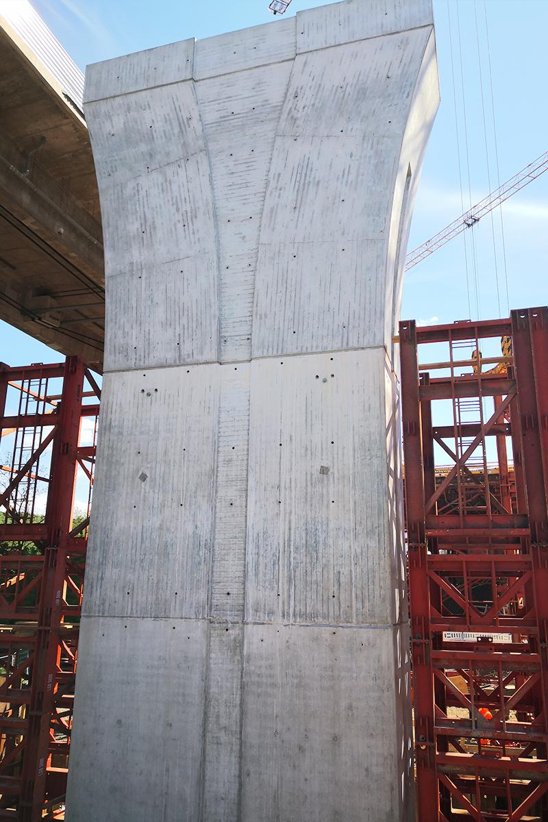 Anzahl und Anspruch machten die Pfeiler gleich in doppelter Hinsicht zum Prüfstein des gesamten Unterbaus: 14 Vollpfeiler je Fahrtrichtung, mit 8 m hohen, muschelartig aufgeweitetem Kopf. Geschalt wurde hier wiederum mit FF20 und Top 50 Komponenten, sowie der Sperrenschalung D22. Gerade die bewährte sich auf der engen Baustelle, indem sie sicheres Arbeiten mit deutlich reduziertem Bühnenaufwand ermöglichte. Die Krux kam in Form der Pfeilerköpfe.