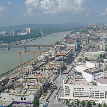 Eurovea, ein Mehrzweckgebäude in einzigartiger Umgebung im Herzen von Bratislava mit einer Gesamtfläche von 38.000 m2. Beim Aufbau dieses imposanten Objektes wurden 1.200 m2 Rahmenschalung Framax Xlife, 630 m2 handliche Wandschalung Frami und 9.000 m2 Deckenschalung Dokaflex eingesetzt.