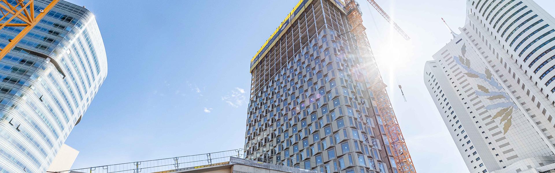 The construction company Granit is currently building the 100 m high DC Tower 3 in the north of Vienna with 34 upper floors and five underground floors. The residential tower, which will house 832 student apartments after completion, is being built as a steel-concrete skeleton structure with flat slabs in weekly cycles.