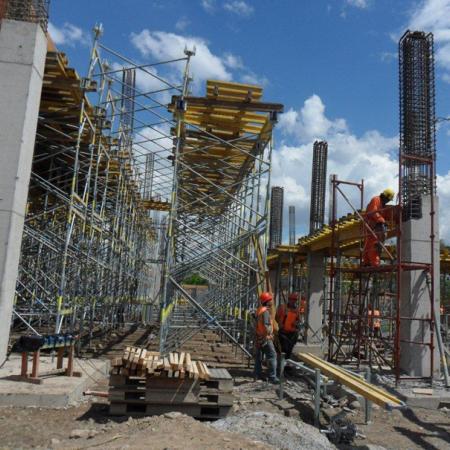 Grandes plantas con altura libre de 7m, la que esta compuesta de losas con vigas y pilares. Son en total 19.000m2 de planta donde se ubicaran tiendas comerciales y supermercado. La solucion de Staxo 40 fue diseñada para evitar la concentracion de torres logrando descargar el peso de la losa y la vigas por una misma linea de torres.
