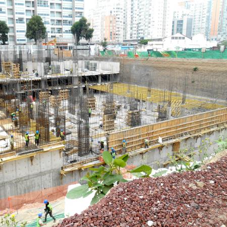 Complejo residencial con estacionamientos y dos torres de departamentos, con el desafio de encofrado y apuntalamiento para colado en semana y media por nivel.
