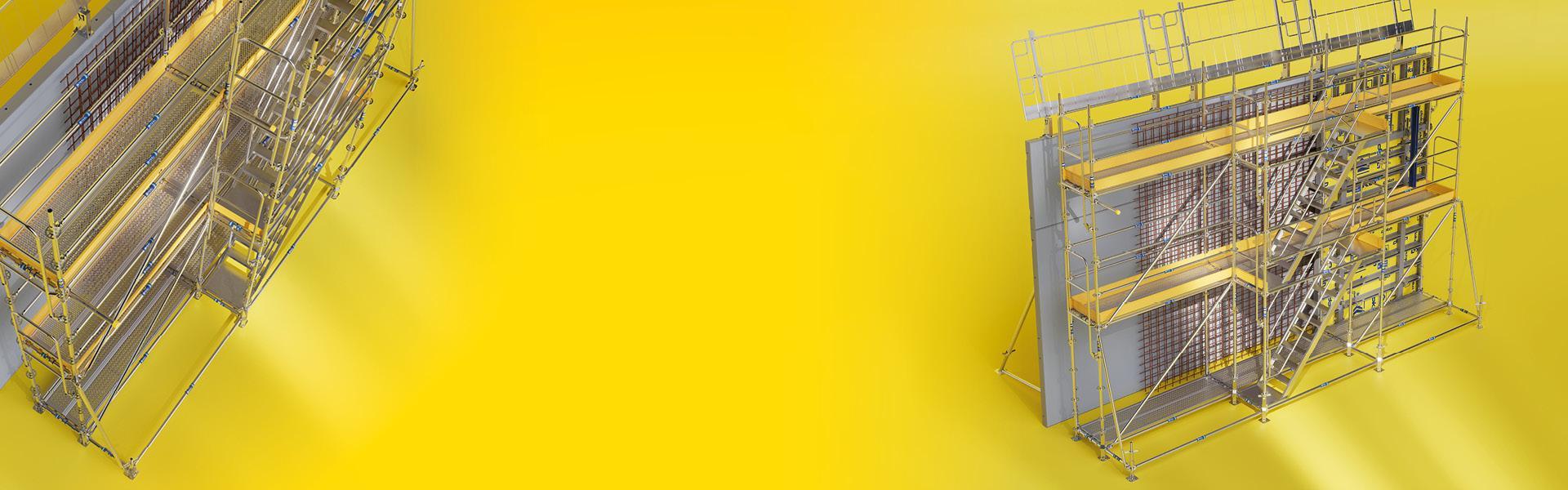 Jusqu’à une hauteur de plateforme supérieure de 4,50 m, les échafaudages de ferraillage Ringlock restent stables sans étaiement supplémentaire contre un mur ou un coffrage, permettant un travail de ferraillage ininterrompu. Grâce à leur grande rigidité structurelle et à la résistance à la traction des connexions, les échafaudages peuvent être rapidement et facilement repositionnés par grue, les rendant immédiatement disponibles sur la zone de travail suivante. Selon les besoins du projet, une largeur d’échafaudage de 0,73 m, 1,09 m ou 1,40 m peut être choisie, par exemple pour permettre le stockage direct du ferraillage sur la plateforme. Pour un accès pratique et sécurisé, des unités d’escalier peuvent être intégrées en option.