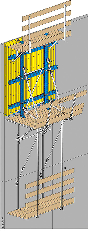 Csupán két alkatrész szükséges (függőállvány és csatlakozó papucs) az összecsukható munkaállvány K és bármely Doka falzsalu kúszózsaluvá való összeépítéséhez.