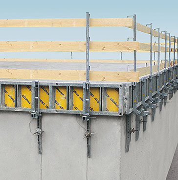 これを使うと、留め型枠が速く簡単に設定できる上、スラブの端部が極めて安全に、また、様々な取り付け方法や留め型枠の種類、さらにスラブ端部の安全防護方法の中から選べるため、より柔軟に留め型枠が設定できます