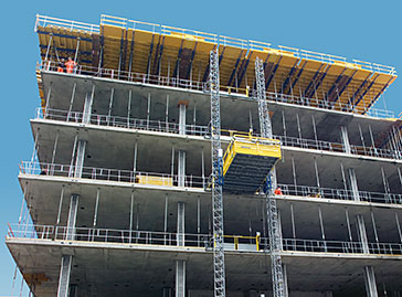 크레인을 사용하지 않고 신속하게 공사를 수행합니다. 테이블 리프팅 시스템 TLS에서 버튼만 한 번 누르면 테이블폼이 다음 슬라브로 이동합니다.