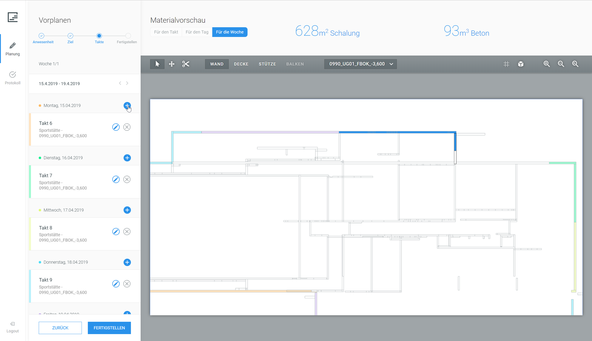 After detailed conversations with foremen of different construction companies, we distilled their input on intuitive cycle planning and developed a software program. Our goal in all this was to provide foremen with a solution that will make their work more enjoyable in order to help ease the burden on the site. Cycle planning is based on ifc models. Processes are automated in the system: it defines the jobs to be completed in which cycle based on available resources.