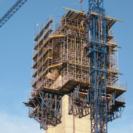 A estrutura de suporte complicada, com uma altura de 14,40 m e com um campo principal de 220 m de comprimento, é fabricada com a ajuda de contrafortes, da cofragem trepante MF 240 e da cofragem flexível Doka Top 50.