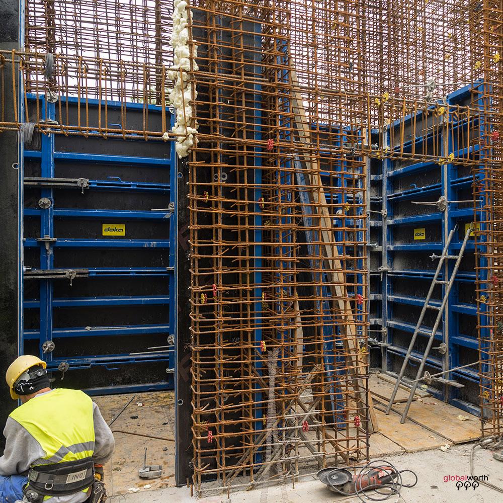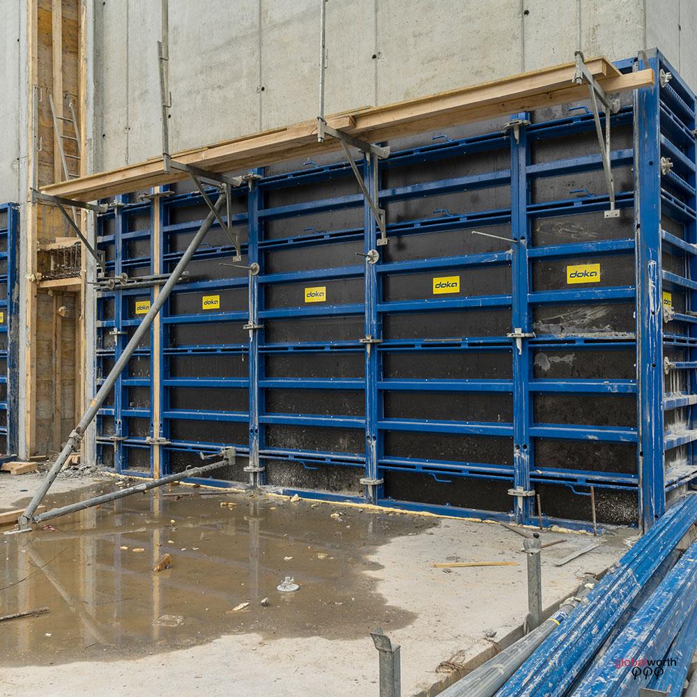 Una din provocările acestui proiect a constat în găsirea unui sistem de cofrare ușor, rapid și care să asigure o desfășurare a activităților în condiții de siguranță în lucru. Pe zona de parter, datorită înălțimii mari, s-a optat pentru utilizarea sistemului Staxo 40, fiind ideal pentru cofrarea planșeelor înalte. În ceea ce privește elementele verticale, sistemul ales a fost Framax Eco pentru robustețea sa.