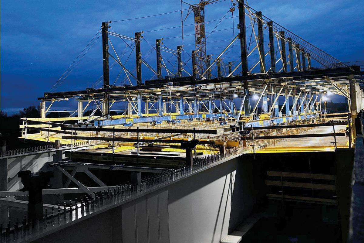 Opažni vozički Doka Composite omogočajo brezhibno prilaganje kompleksni in spreminjajoči se geometriji 941 metrov dolgega avtocestnega nadvoza.