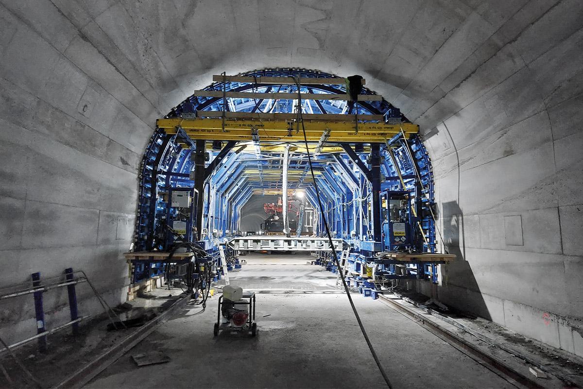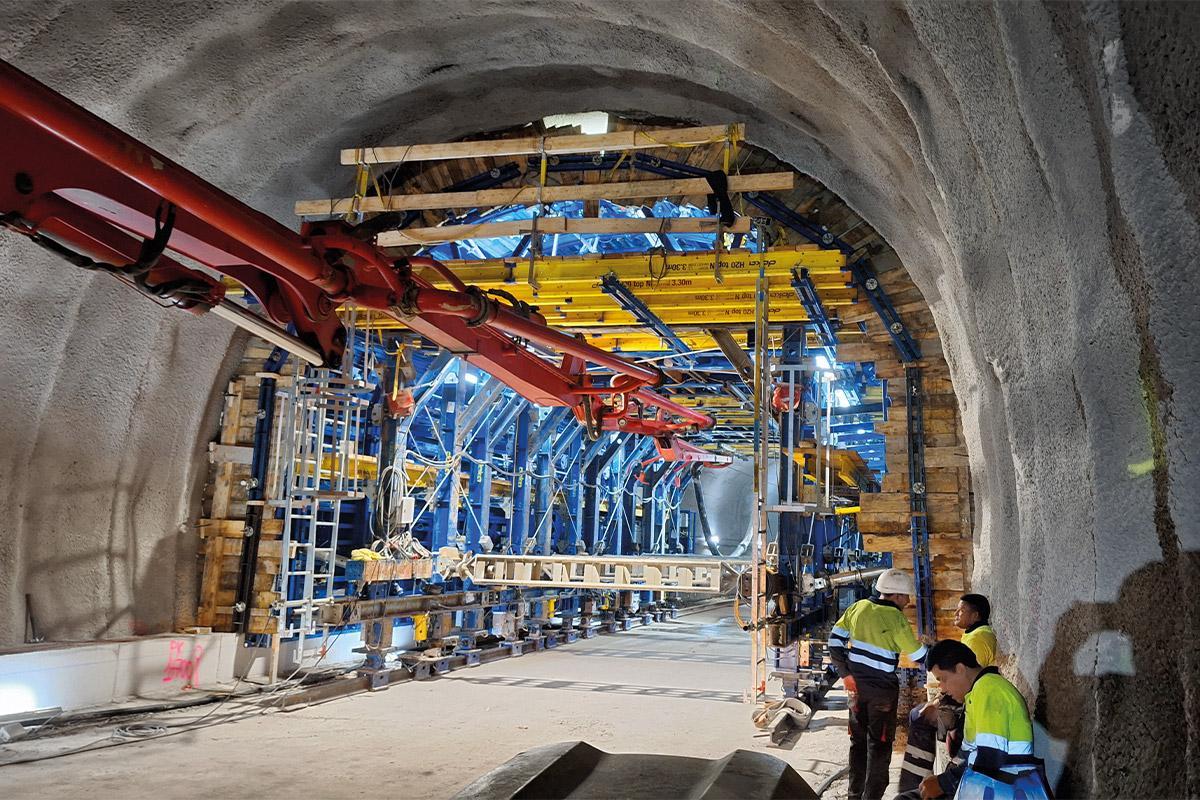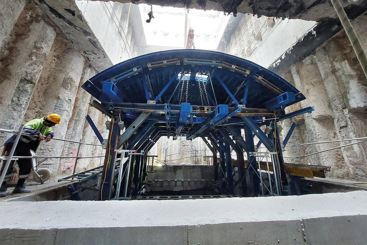 Gradnja vključuje novo postajo, črpalne in prezračevalne jaške ter izhode v sili. Ključni del projekta predstavlja 2.700 metrov dolg predor, od tega je bilo 1.400 metrov zgrajenih s pomočjo dveh Doka modularnih opažnih vozičkov z večnamenskim nosilnim sistemom Doka SL-1. Modularna zasnova opažnega vozička z jeklenimi ploščami SL-1 in prečnimi oporami je odpravila potrebo po stenskih sidrih, kar je omogočilo dnevne cikle betoniranja in hiter potek del. Po betoniranju so se opore enostavno odstranile z viličarjem, kar je omogočilo hiter nadaljnji potek del. Integrirane vrtljive ploščadi so zagotavljale natančno poravnavo vozičkov tudi na krivinskih odsekih, medtem ko je delovanje 7,5 m dolgega vozička neposredno na betonski podlagi brez tirnic dodatno pospešilo gradnjo in omogočilo pravočasno izvedbo zahtevnega projekta.