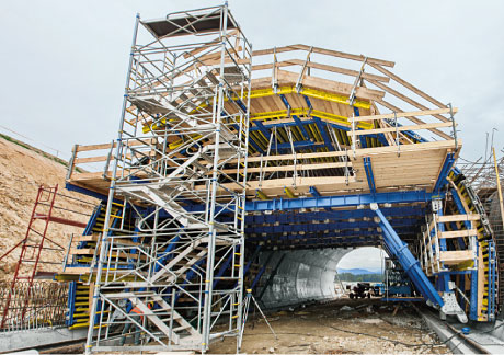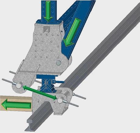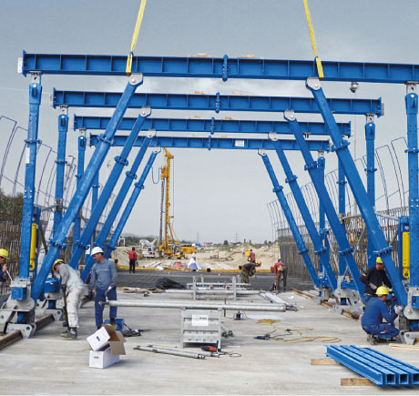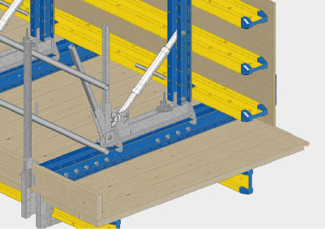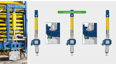 Hidravlična dvižna naprava omogoča enostavno dvigovanje, spuščanje in natančno naravnavanje opažnega vozička. Inovativna konstrukcija zagotavlja, da opažni voziček tudi med prečnim pomikom varno stoji na voznih tirih in ne more iztiriti. Dela se lahko pospešeno izvajajo, saj se opažni voziček lahko iz vsakega položaja spusti neposredno na vozne tire.