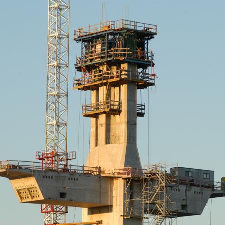 With its twin 18 m wide decks, this cable-stayed bridge near Lake Erie in Ohio puts an end to the bottleneck caused by the old bascule bridge at this site. The pylon tapers as it rises, providing a brand-new landmark for the 'Glass City' of Toledo.