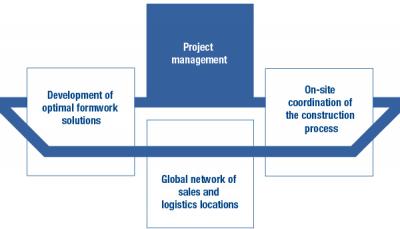 Every construction site goes through its own process from planning stage through to completion. And, the sooner we join the process, the better our understanding of the project and the more we can improve its efficiency. We are happy to support our customers in any phase of their formwork projects. And we provide a single-source for products, services, planning, project management and logistics. Only a few companies can offer this understanding of the many aspects of a construction project.