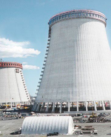 Doka's SK 175 cooling tower formwork system consists of adjustable steel formwork panels connected to a fully mechanized automatic climbing system that is anchored to the previously cast concrete rings of the tower.