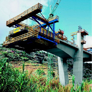 With the newly developed cantilever forming traveler, the 20 ft. long deck segments of the Viaducto de Teror are being cast in a weekly cycle. The pier-heads on this technically challenging bridge project were also cast using the CFT.
