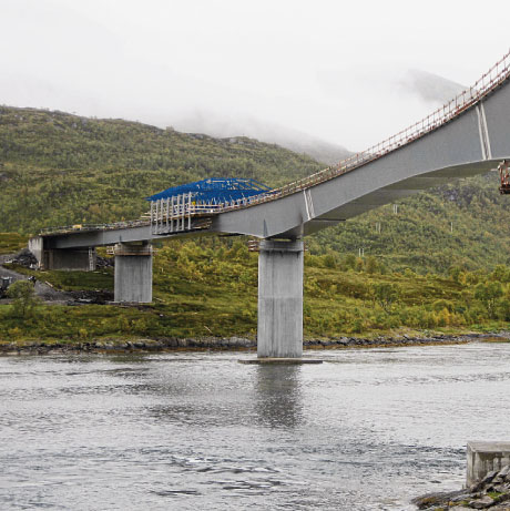 The 28 casting sections for the carriageway slabs of the Vesterstraumen and Austerstraumen Bridges were poured using two composite forming carriages in an irregular "back-step" sequence. The weekly cycle achieved here made it possible to complete the project on time.